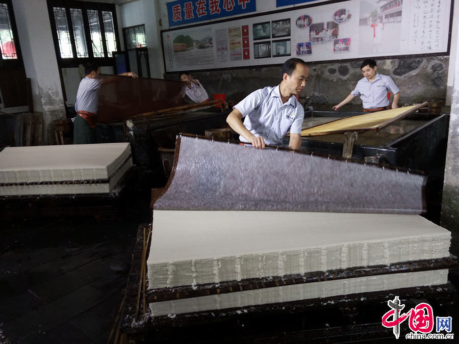 每天的凌晨4点开始,他和师父都会双手托住竹帘,以约30度斜角插入水中十厘米左右,稍停顿一下又麻利地从水中抽出。他手腕一抖,竹帘子上沾了一层白色的纸浆。随后,师徒二人跨步转身,熟练地将竹帘倒扣在池边的一个石板上,制作一张j9九游会 - 真人游戏第一品牌最重要的步骤就算完成了。看似简单的一捞一提,最考验操作者的手感,一张纸的厚薄和均匀,全看技术,竹帘伸得过深,上面的纸浆就太多,捞出的纸张就厚,入水太浅纸张又太薄。“捞纸”时用力不匀,竹帘上沾的纸浆就不均匀,捞出的纸会厚薄不均。